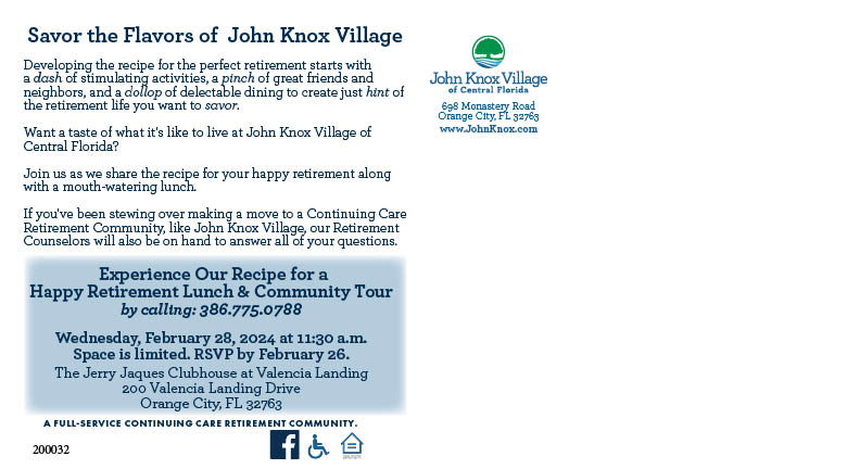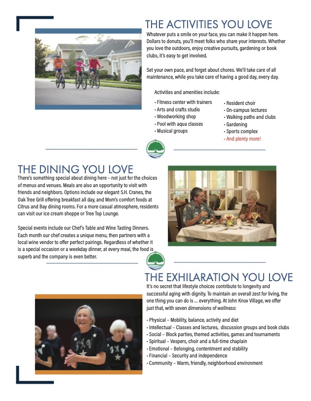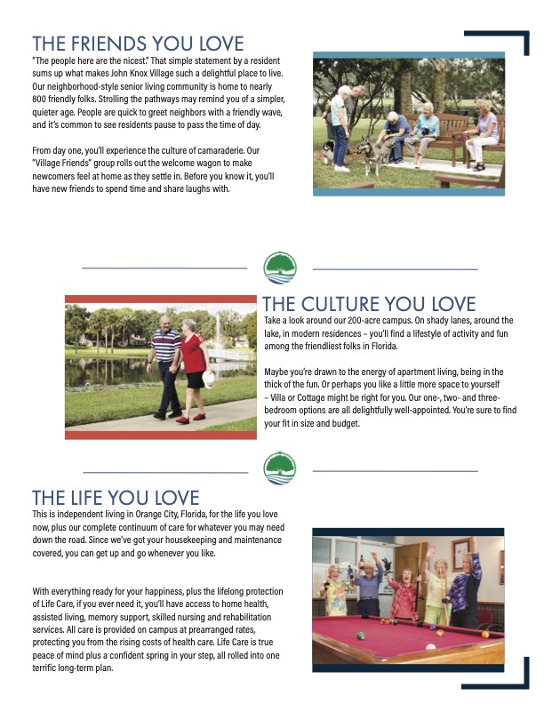 In order to build census, like many other Senior Living Communities nationwide, John Knox Village hosts events ranging from informational seminars to social gatherings in order for prospective residents to get a feel for what it is like to reside in a LifeCare Plan community. Below are a few samples of direct mail pieces targeted to attract prospective residents as well as collateral material.